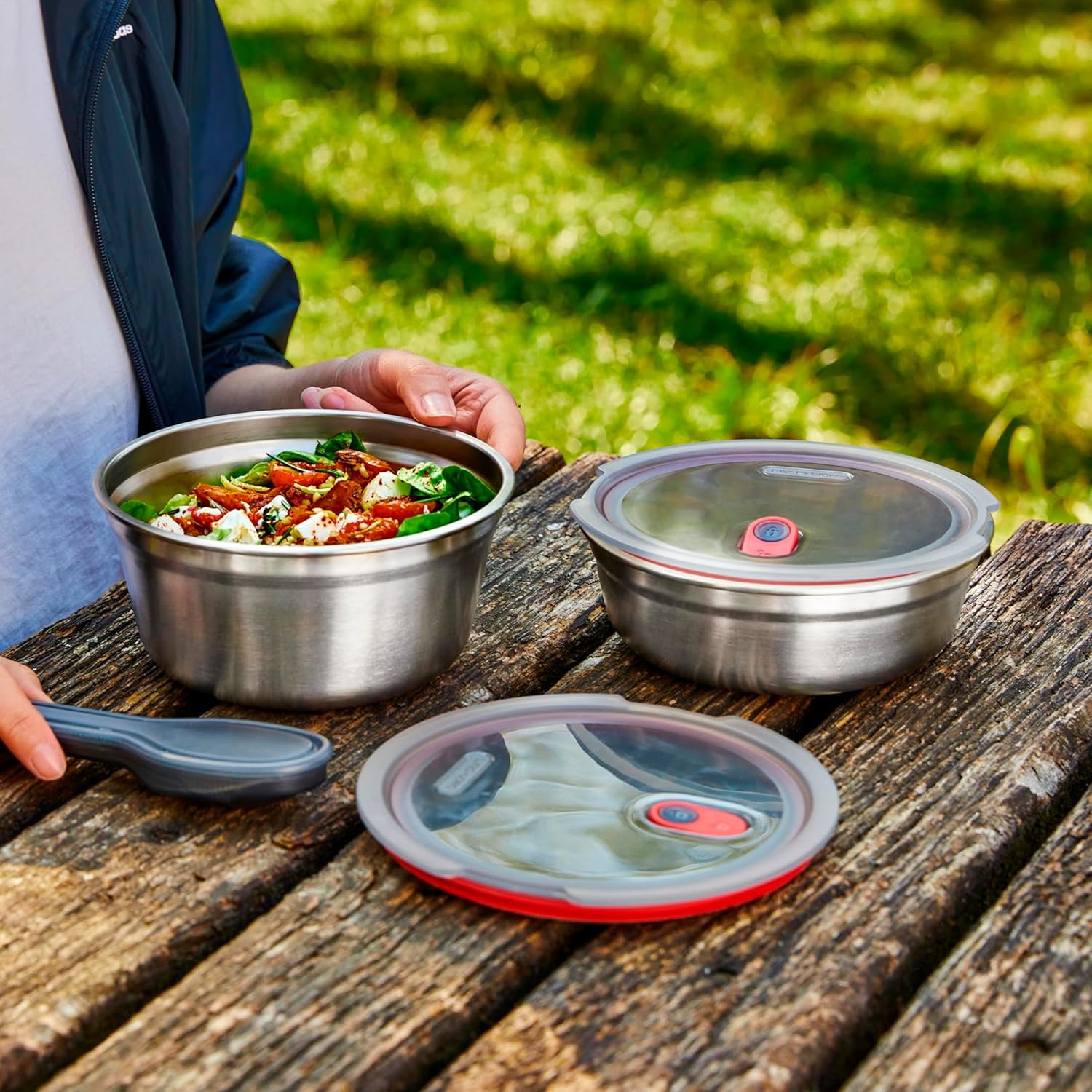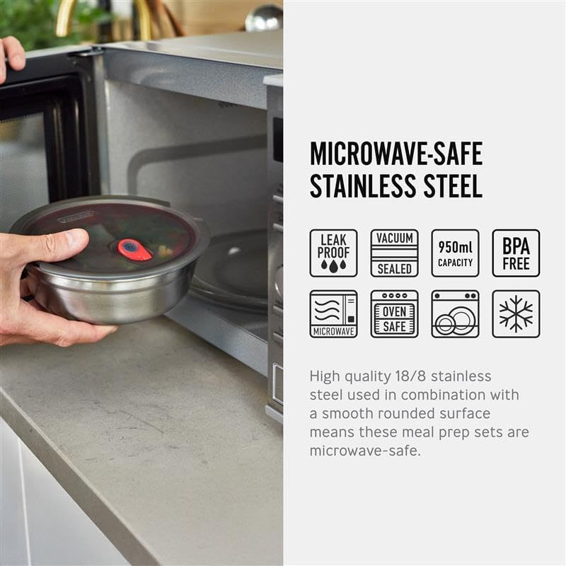 طراحی هوشمندانه – استیل باکیفیت 18/8 همراه با سطحی صاف و گرد باعث شده این کاسه‌های نگهداری غذا برای استفاده در مایکروویو مناسب باشند تا بتوانید غذاهای گرم را در مسیر نوش جان کنید. همچنین قابل‌استفاده در فر (به‌جز درب)، فریزر و ماشین ظرفشویی هستند.