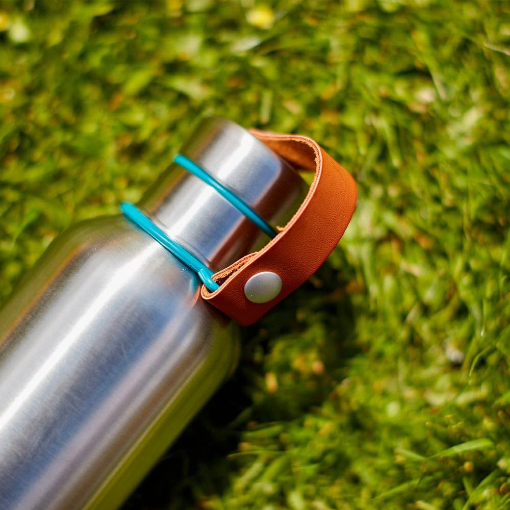 بند حمل از چرم وگان – این بند فقط یک اکسسوری زیبا نیست؛ بلکه کمک می‌کند دیگر هرگز درِ بطری را گم نکنید. بند به‌طور محکم با یک حلقه استیل رنگی دور گردن بطری و یک پرچ روی درِ بطری ثابت شده است.
